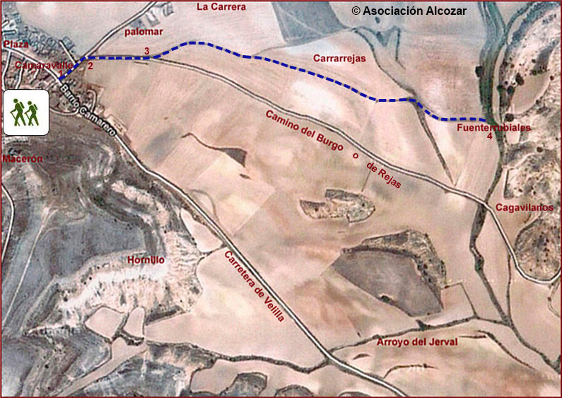 Esta ruta parte de la calleja que sale de Camaravalle (1) en dirección a La Carrera. Acabadas las casas y corrales (2), hay que torcer a la derecha por el Camino del Burgo, también conocido como Camino de Rejas. En el punto 3 tendremos que coger un sendero a la izquierda que nos llevará hasta Fuenterrubiales (4). Volveremos por el mismo trazado.