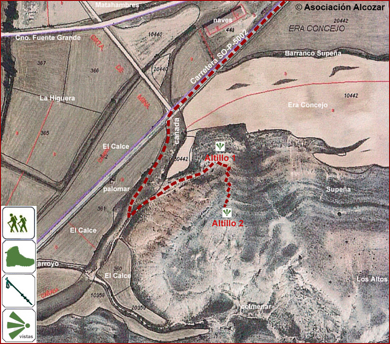 Longitud ida y vuelta Altillo 1: 1.400 m. Longitud ida y vuelta Altillo 2: 1.580 m. Altitud máxima (Altillo 2): 937 m. Dificultad Altillo 1: media-alta. Dificultad Altillo 2: alta (inclinación de la pendiente y cantos rodados). Recomendaciones: Imprescindible bastón y calzado apropiado.