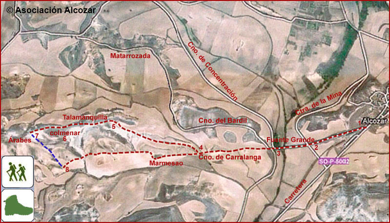 Partimos del Museo Textil (1) y seguimos el camino que lleva a la Fuente Grande (3) después después haber atravesado la Carretera de la Mina (2). Desde la Fuente Grande, dejando a la izquierda el Camino de Concentración, continuamos recto por el Camino de Carralanga hasta llegar a un arroyo (4) y giramos a la derecha para seguir una senda que lleva a Talamanquilla (5).