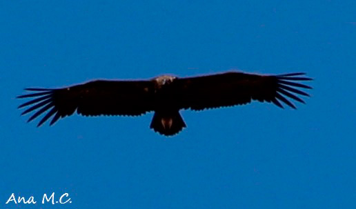 Buitre negro (Aegypius monachus, Linneus 1766) sobrevolando El Bancho, 24 de agosto 2020 (Ana Montoya Coca)