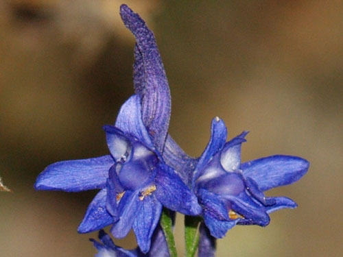 Planta anual con tallos de 20 a 90 centímetros de altura. Hojas profundamente divididas. Inflorescencia laxa con flores azules o blanquecinas. Pétalos laterales con limbo oblongo o subrectangular, de mayor longitud que anchura. Semillas numerosas. Crece en pastos secos y zonas sin cultivar.