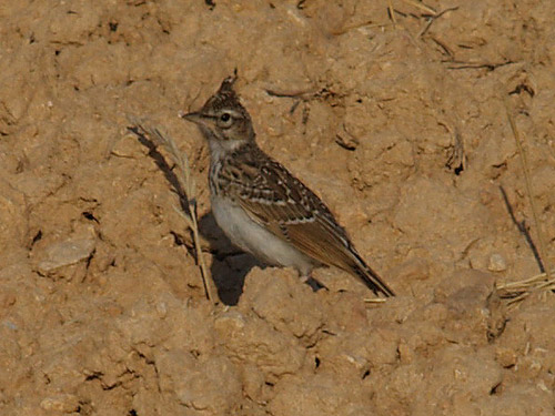 Habita en zonas de cultivo, caminos y pastizales. Tiene una notoria cresta puntiaguda.