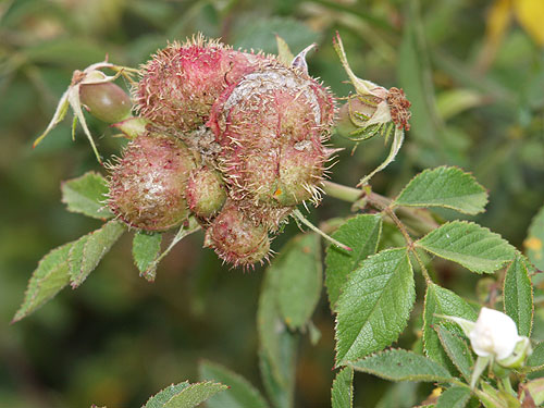 Tumoración, agalla (cecidia) de Rosa canina en la que se alojan los huevos del insecto Diplolepis mayri.
